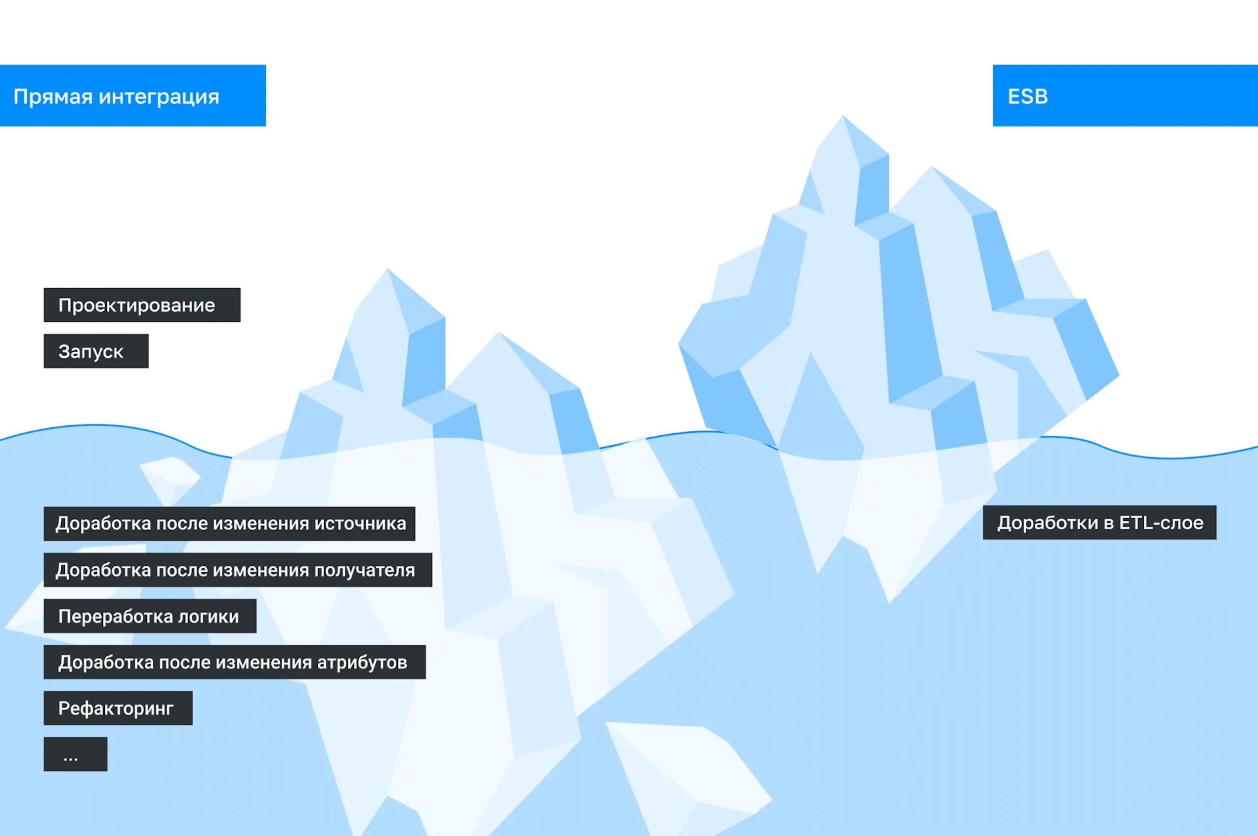 Трудозатраты при подготовке к запуску шины отражаются и на внешней дороговизне интеграций. Вам придётся уже на старте заплатить и за бизнес-анализ, и за продумывание логики интеграции, и за внедрение инструментов шины — ETL-слоя, DWH и т. д. По нашему опыту, это примерно 90 % от стоимости внедрения и владения ESB. Оставшиеся 10 % — это поддержка уже готовых интеграций.