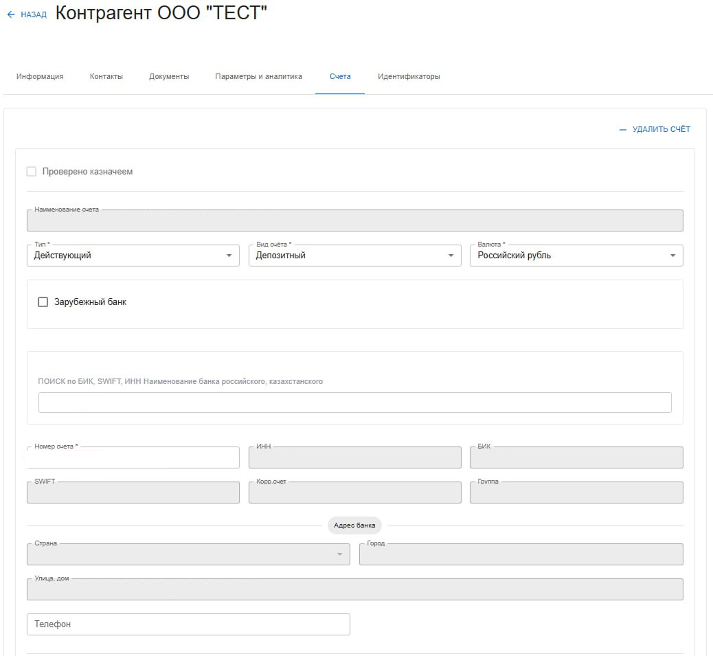 - Проверка реквизитов и адресов на входе через DaData. Некорректные значения не сохраняются — это предотвращает ошибки в отгрузках (УТ), платежах и бюджетах (БИТ.ФИНАНС) и проводках (Бухгалтерия).